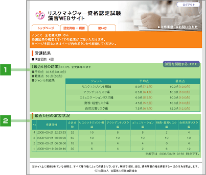 ()内の赤字の点数は全受講者の数字になります。 - 最近5回の演習結果がジャンルごとに表示されます。